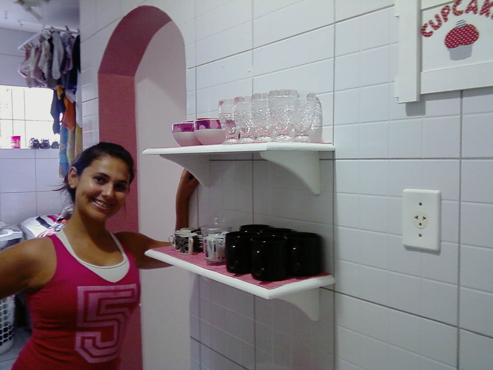 Vou colocar embaixo delas os ganchinhos para pendurar as xícaras, aí ela ganha mais espaço.
